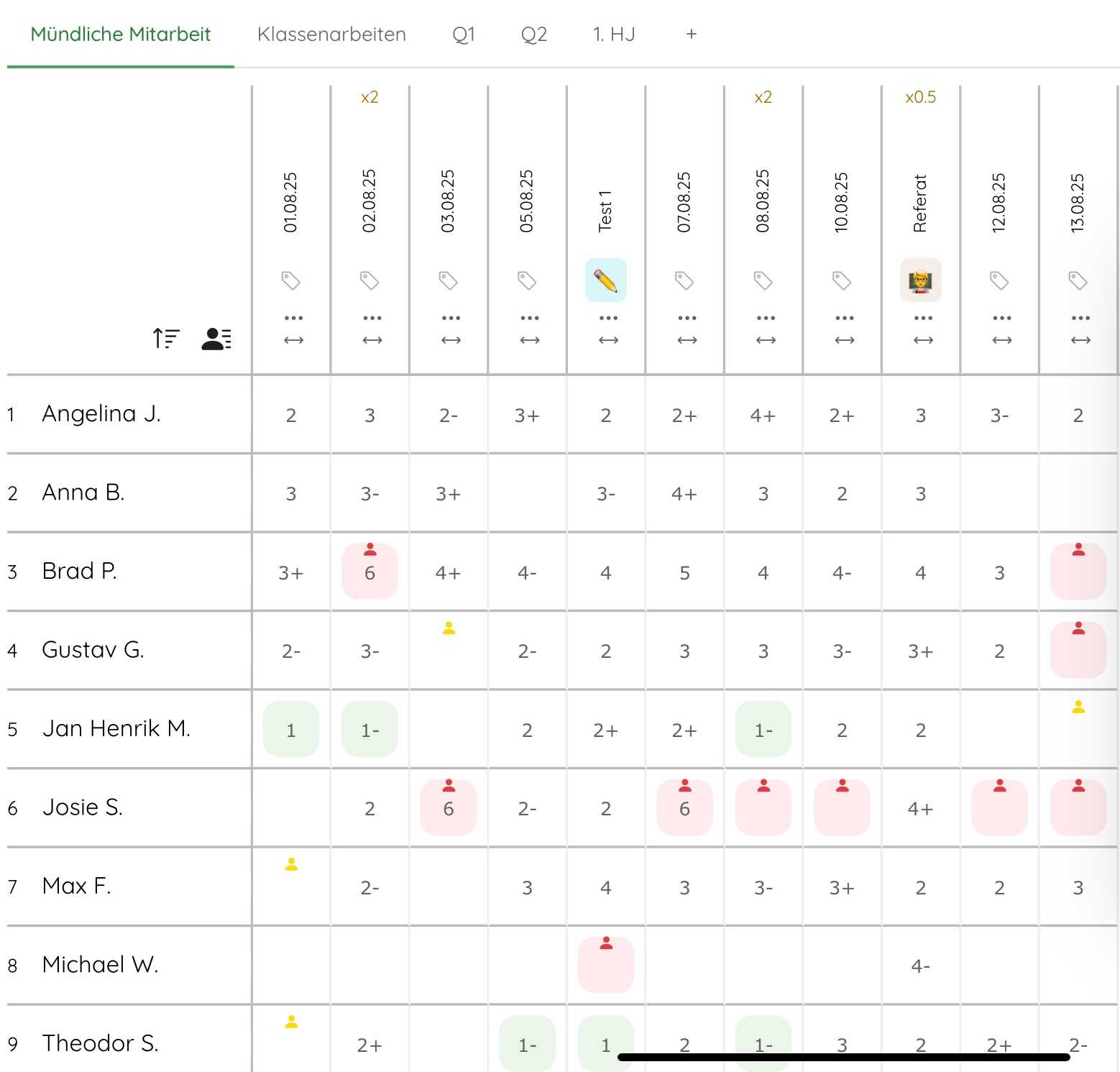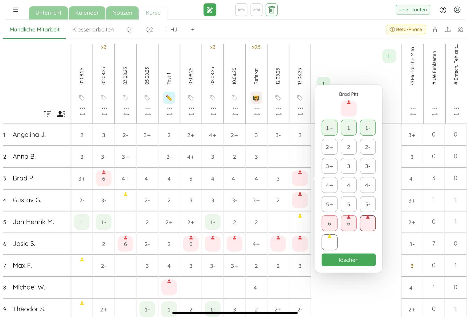 Hier kannst du Noten eingeben oder Fehlzeiten markieren.