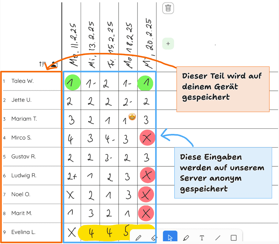 Die sensiblen Daten deiner Schüler werden nur lokal auf deinem Gerät gespeichert und nicht in der Cloud. So bist du auf der sicheren Seite. Die anonymisierten Noteneinträge sind sicher bei uns gespeichert.