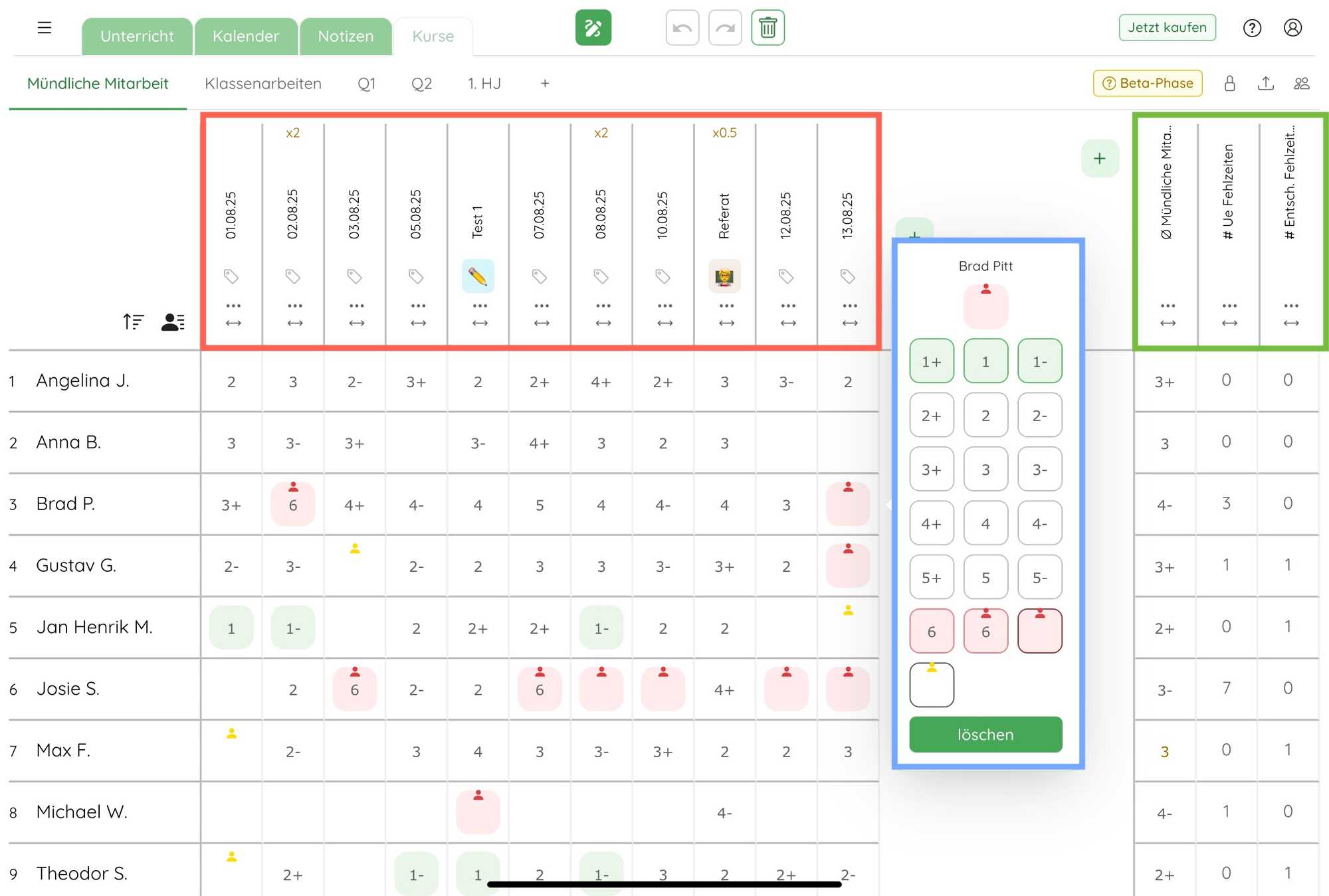 Hier kannst du Noten eingeben oder Fehlzeiten markieren.